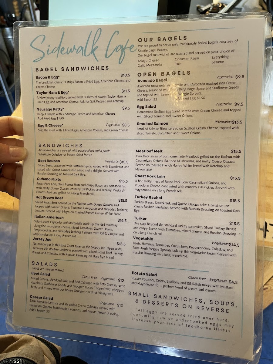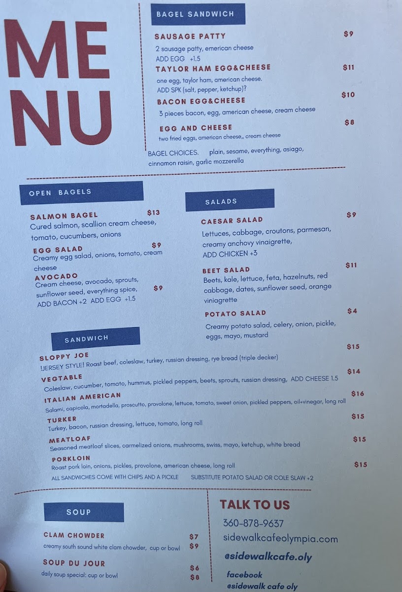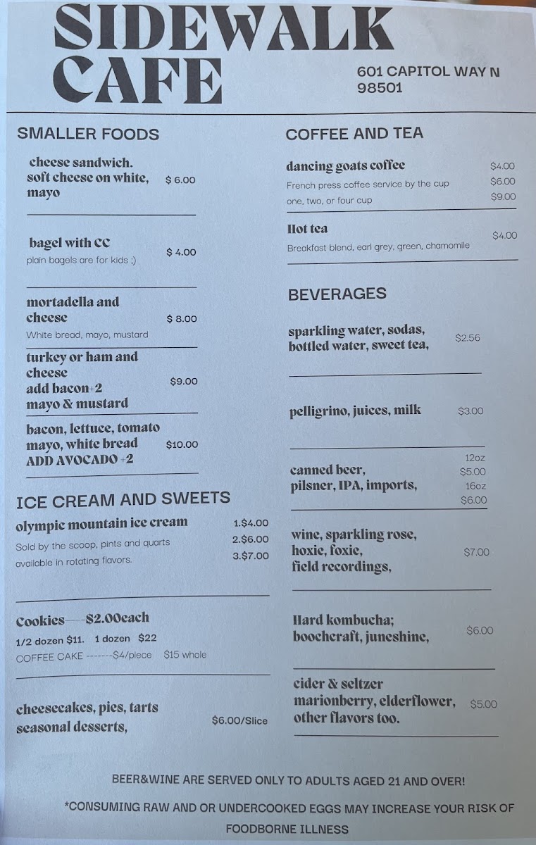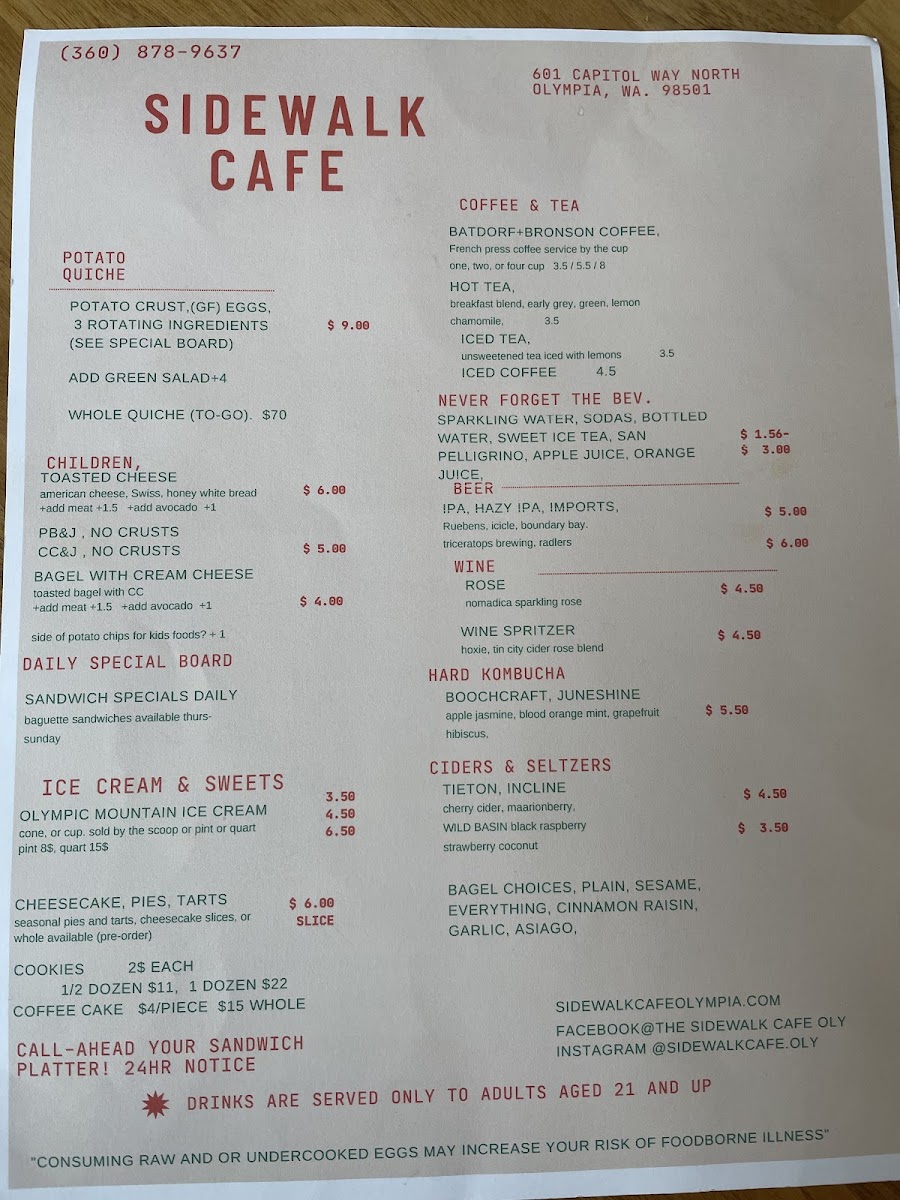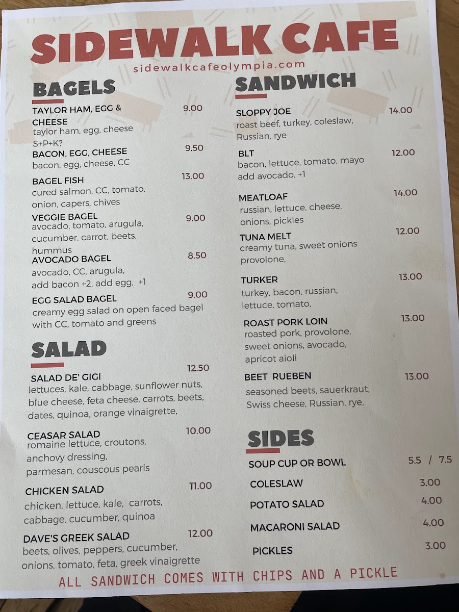 At Sidewalk Cafe (601 Capitol Way N, Olympia, WA 98501), the menu comes together as a thoughtful, well-rounded reflection of a neighborhood café that balances comfort with creativity. It starts simply with Sesame Bagel, Cinnamon Raisin Bagel, Garlic Mozzarella Everything Bagel, and Asiago Bagel, which set a solid foundation for both light bites and heartier combinations. Freshness and variety continue in the salad lineup-Potato Salad, Caesar Salad, and Beet Salad-while the soup offerings like Clam Chowder Cup, Clam Chowder Bowl, Soup De Jour Cup, and Soup De Jour Bowl provide warm, satisfying options throughout the day. The sandwich selection is where the café’s personality really shines, ranging from bold flavors in the Beet Reuben and Cubano Mixto Vegetable to classic comfort with Roast Pork Loin and Turkey Rachel. Smaller options such as Build Your Own, Cream Cheese Bagel, Bacon, Lettuce, Tomato, Mortadella & Cheese, and Cheese Sandwich make the menu approachable for quick meals. Beverage choices like 20oz Fruit Iced Lassi, Fruit Juice, 24oz Iced Tea, San Pellegrino, and Bottled Milk complement the food well, while board specials-Quiche, Sandwich Special, and Quiche W/Salad-add daily appeal. Bagel sandwiches including Taylor Ham & Egg, Smoked Salmon, Sausage Patty Egg Salad, and Avocado Bagel round out the savory side, and desserts such as Olympic Mountain Ice Cream, Sour Cream Coffee Cake, Cakes, Pies, And Flans Slice, and Cookies offer a comforting finish. Overall, the menu feels cohesive, generous, and welcoming-perfectly suited to a relaxed café experience in downtown Olympia.